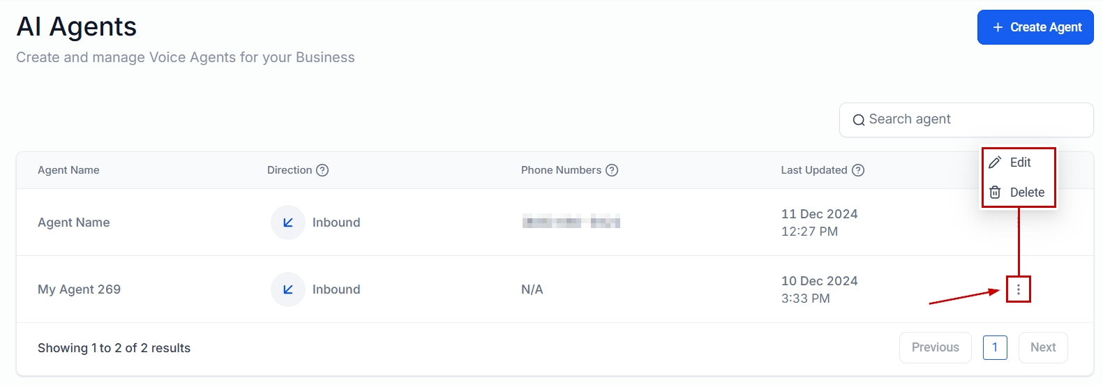 Once an agent has been created click the three dots next to it to edit or delete it.
