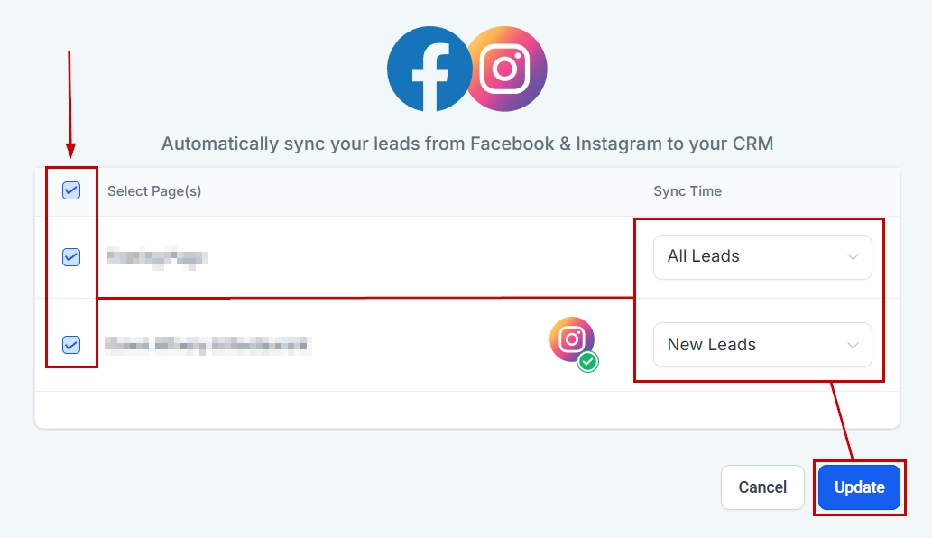 Check the box next to the pages you'd like to connect, set the leads that should be synced (All leads or only new leads after connection), then click Update.