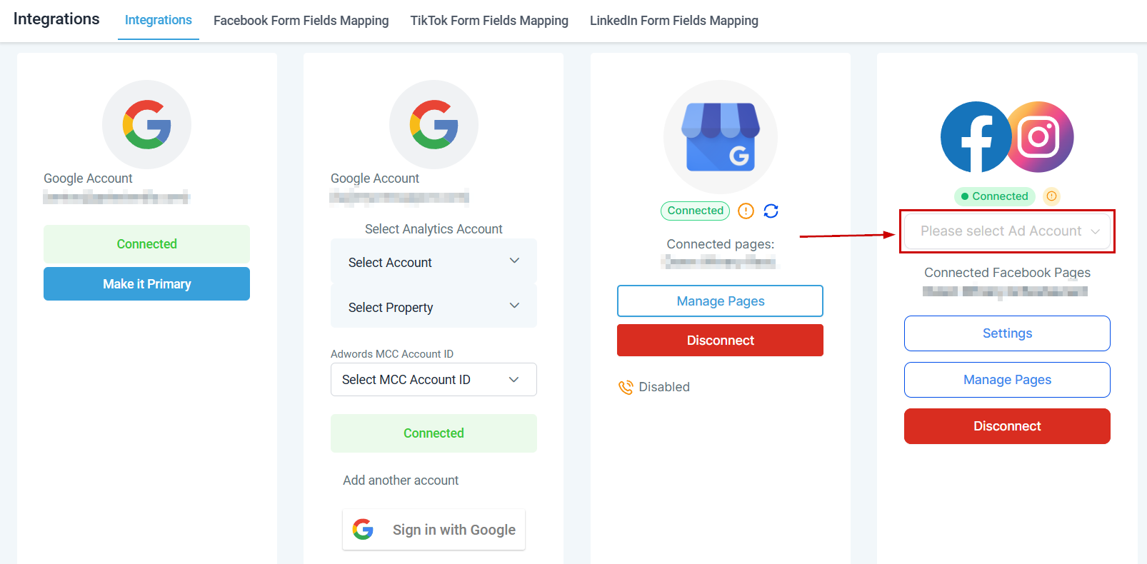 If you wish to integrate your Facebook ads account, select the Ad account from the dropdown.