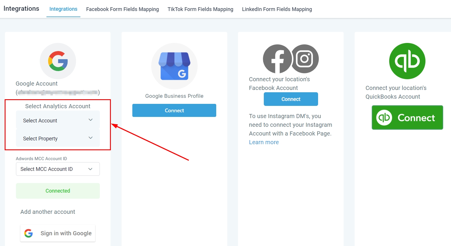 Select the Account and Property from the dropdown to connect your Analytics account.