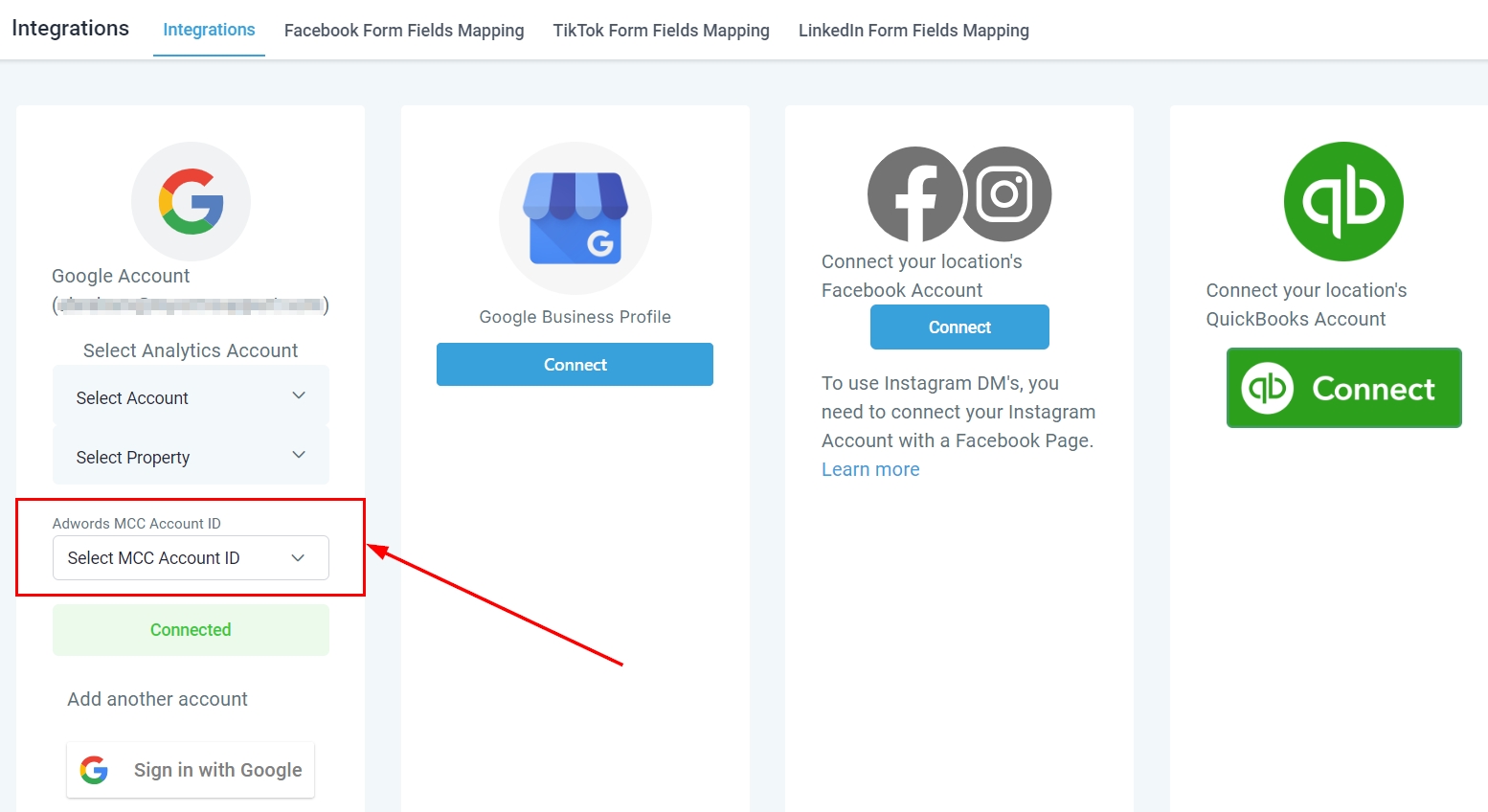 Select your AdWords MCC account ID from the dropdown menu. Verify that it corresponds to the correct Google Ads account by checking the customer ID menu within Google Ads.