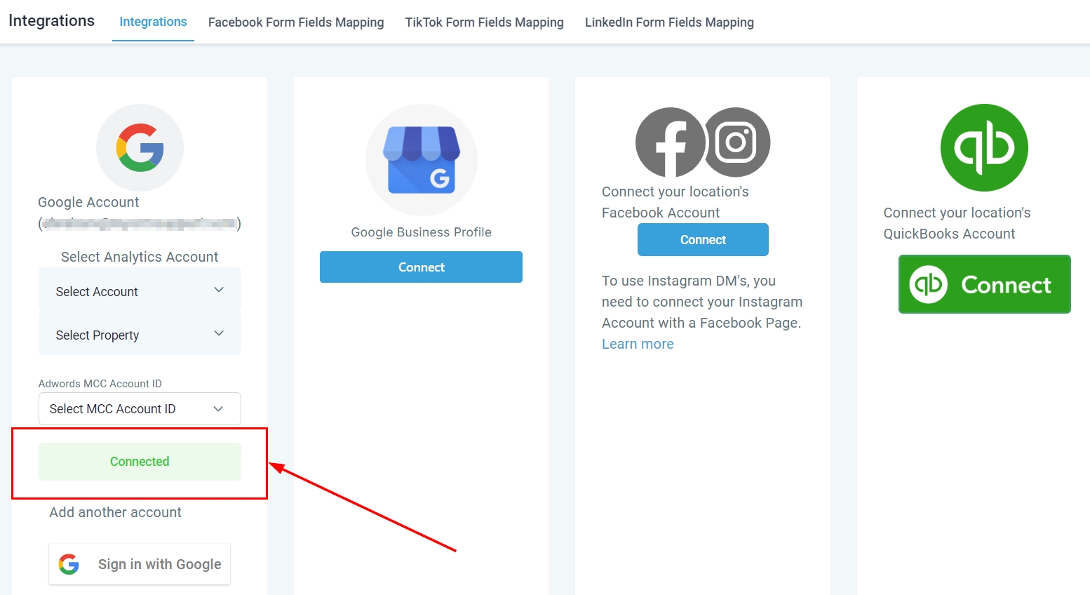 To begin connecting your Google account, navigate to the Integrations section within your account settings. Next, click on the 'Sign in with Google' button.