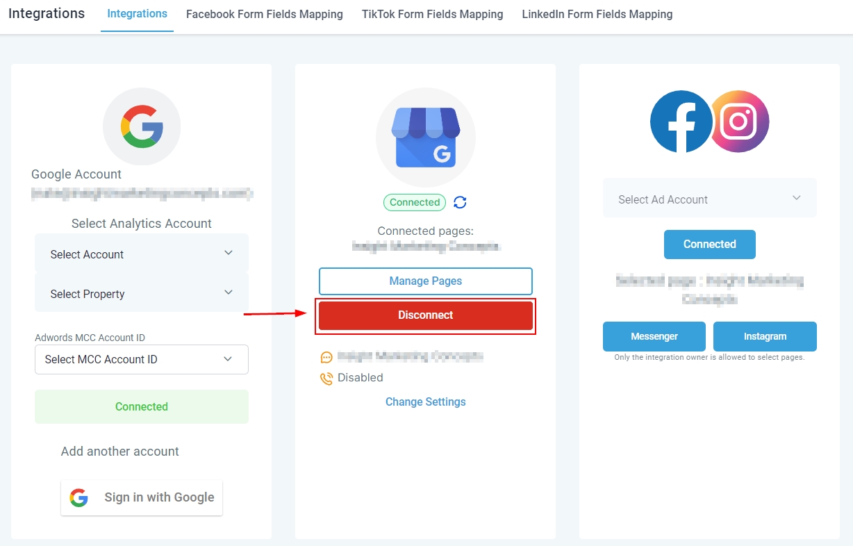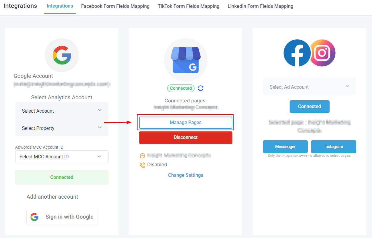 You can also change the connected page or add more by clicking Manage Pages. This will open a list view of any pages you have under the same Google Account.