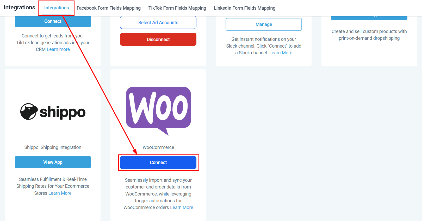 Navigate to the Settings section within your account, and locate the Integration tab. From there, click the Connect button within the WooCommerce tile to initiate the setup process.