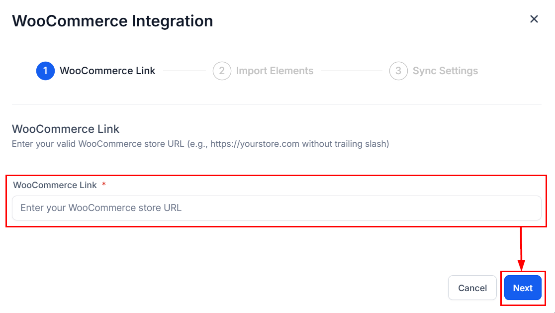 A pop-up modal will appear, prompting you to enter your WooCommerce store URL without a trailing slash (e.g., https://yourstore.com).