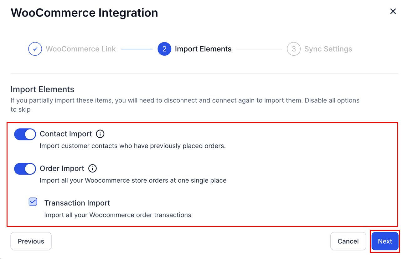 In the next step, you'll be directed to the Import Elements screen, where you can choose which data to import from your WooCommerce store. The available options include: