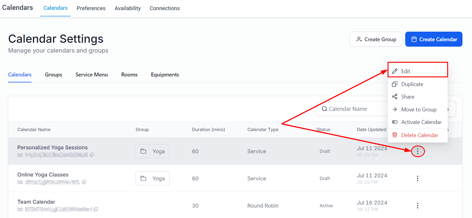 Edit Your Calendar: From the Calendar action dropdown, select the Edit option.