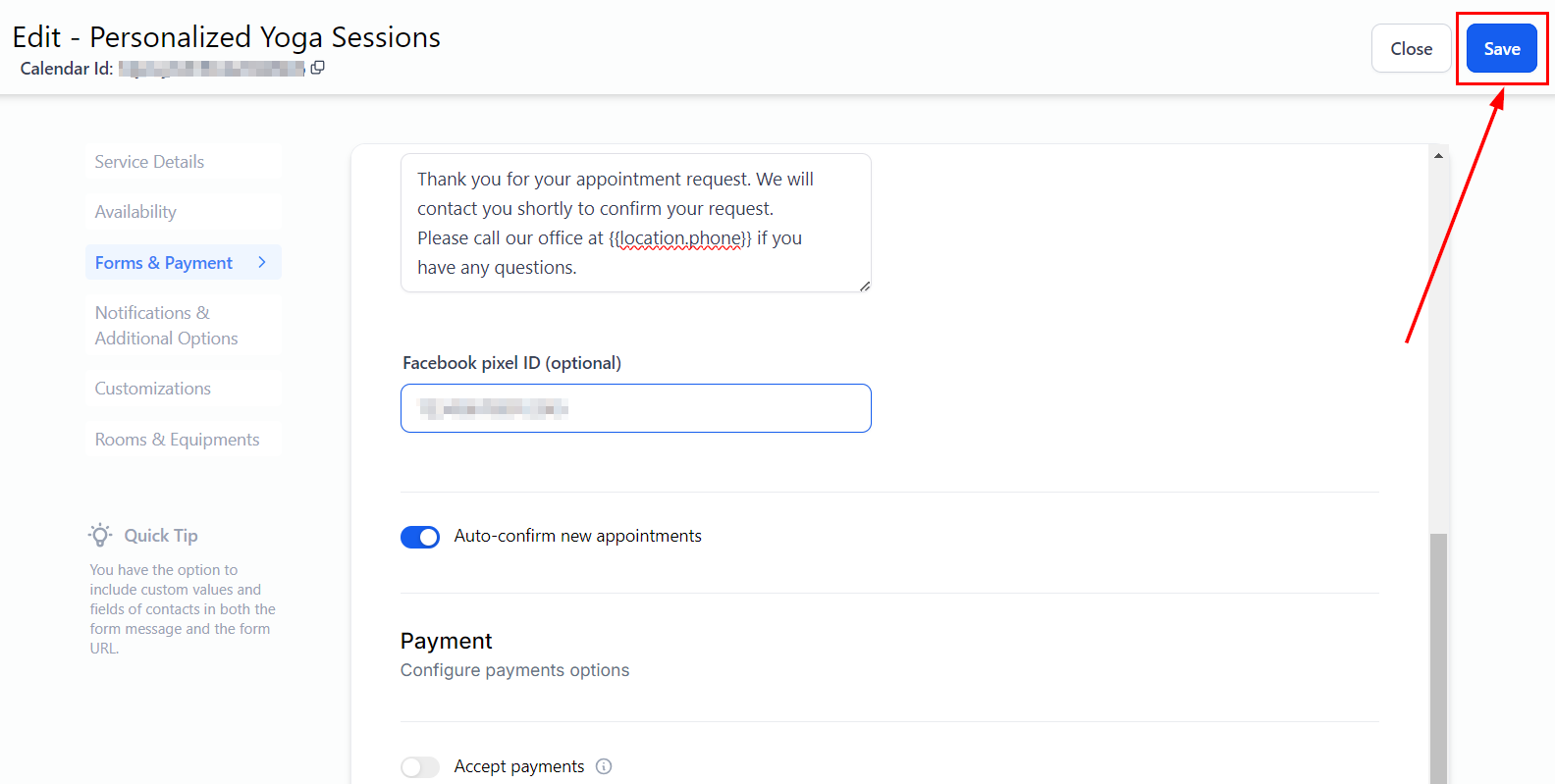 Add Your Pixel ID: Navigate to the Forms & Payment section, where you can enter your Facebook Pixel ID in the designated Pixel ID field.