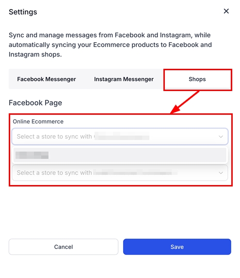 Use the Settings option in the Facebook and Instagram Integration card to link shop pages to their respective e-commerce stores.