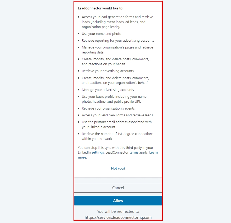 Click on the connection button and allow the necessary permissions for the CRM to access your LinkedIn account.