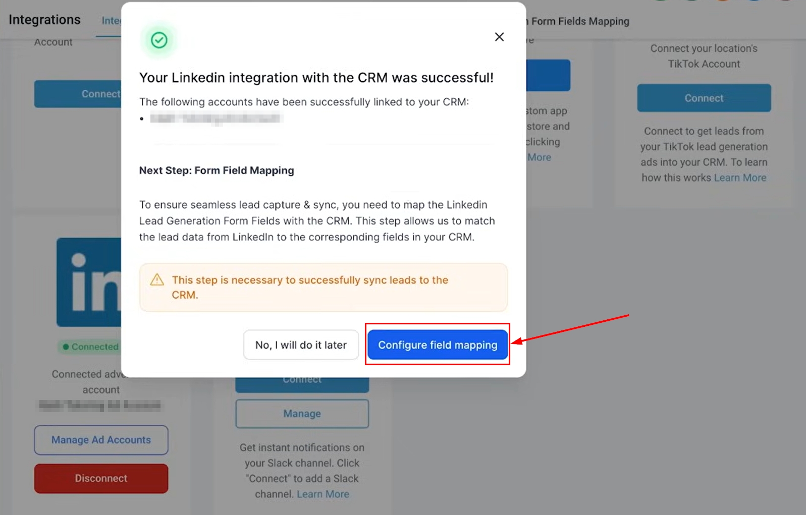 Configure field mapping to align LinkedIn lead form fields (e.g., first name, last name, email) with the corresponding fields in your CRM.