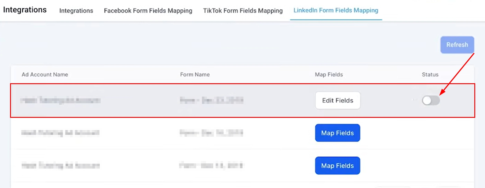 After configuring field mapping, toggle the Status switch to the on position to start syncing leads from LinkedIn to your CRM automatically. The switch will turn blue when enabled, indicating that syncing is active.