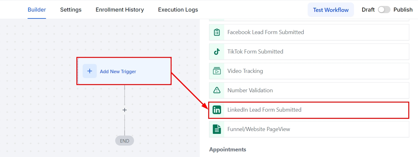 Create a new workflow or edit an existing one to include a trigger for LinkedIn lead form submissions.