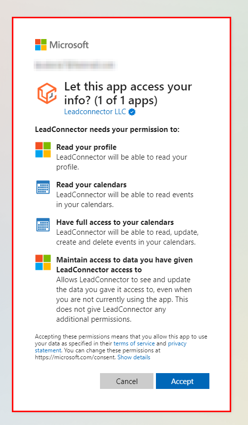 Grant the CRM permission to access your Microsoft account information.