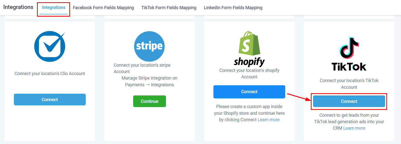 Start by navigating to your CRM's Integration Section and clicking the Connect button for TikTok.