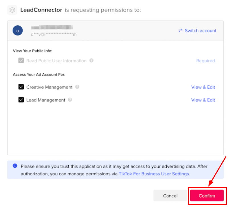 Carefully review the requested permissions presented in the modal. Once you have verified that the permissions align with your integration needs, click the Confirm button. This step is critical to ensuring that your CRM can fully leverage TikTok's capabilities without any access issues.