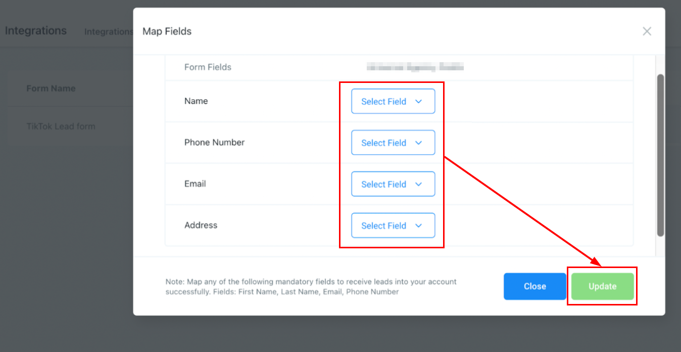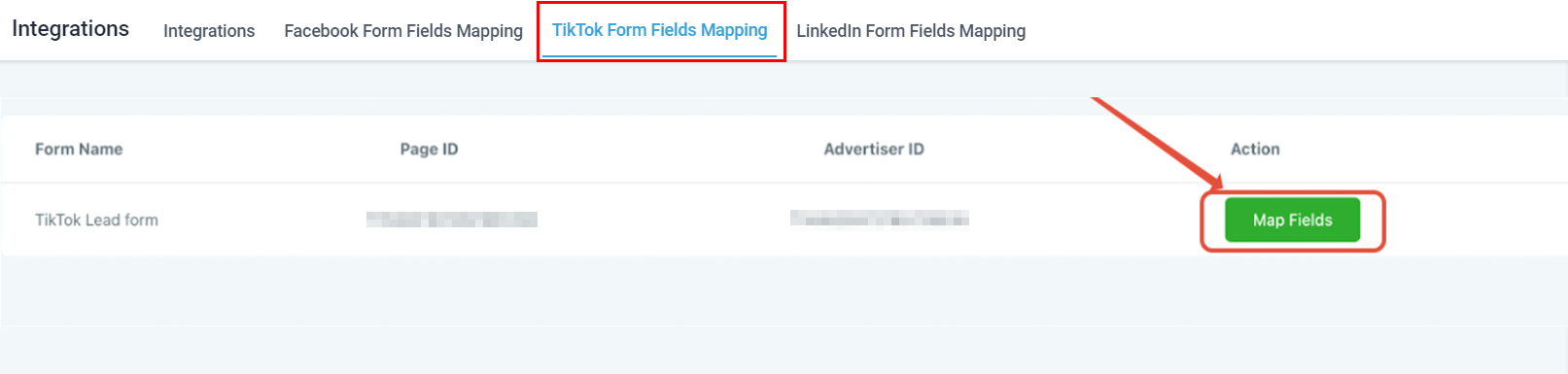 After connecting your TikTok business account, navigate to the TikTok form mapping tab to view all the pages and forms you have created. Click the 'Map Fields' button to assign each form field to its corresponding CRM field.