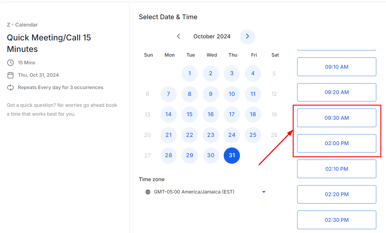The live calendar should now reflect available time slots, excluding the period of your test event, with the 10 a.m. to 2 p.m. window marked as busy. The display of your calendar will vary based on the configured meeting intervals and durations.