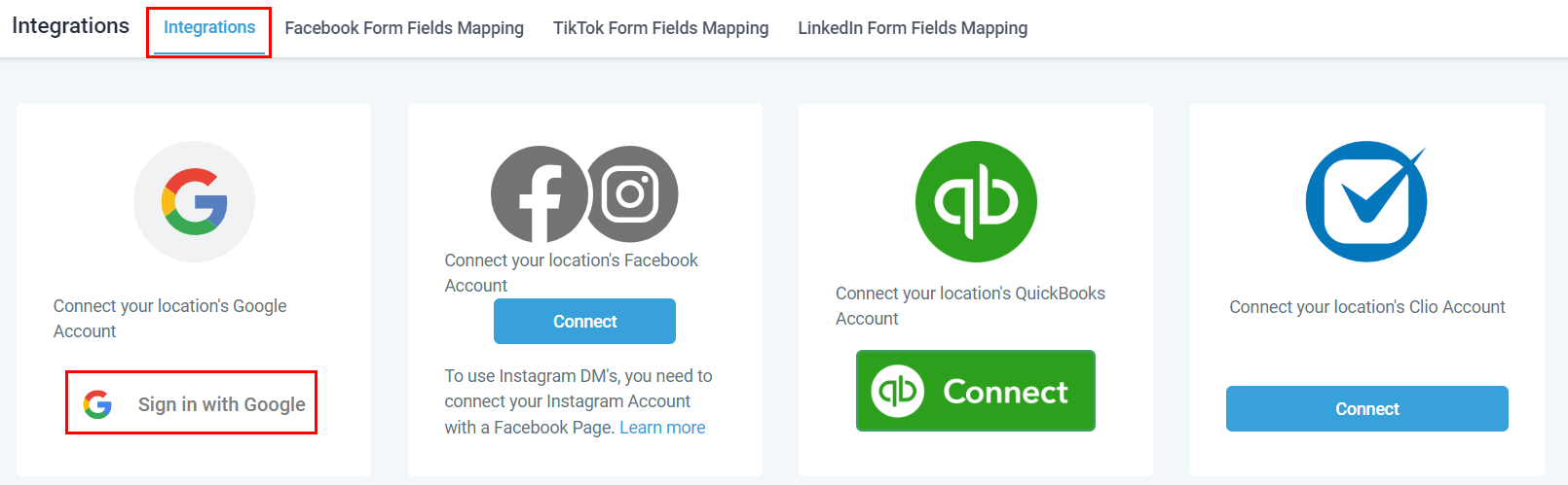 This will redirect you to the Integrations section where we will click the Sign in with Google button to proceed.