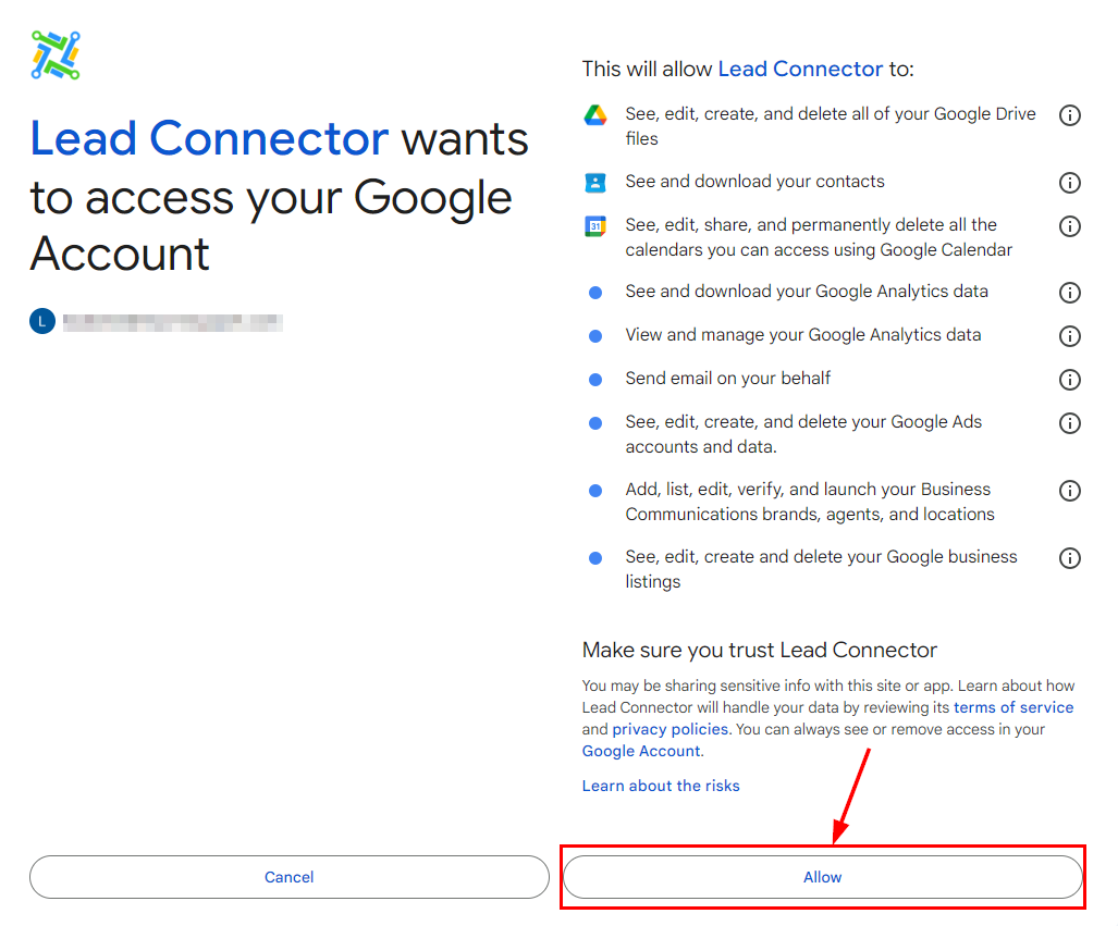 Before completing the integration, review the Terms of Service and Privacy Policy. Once you are satisfied, click Allow to grant the necessary permissions and finalize the integration process.