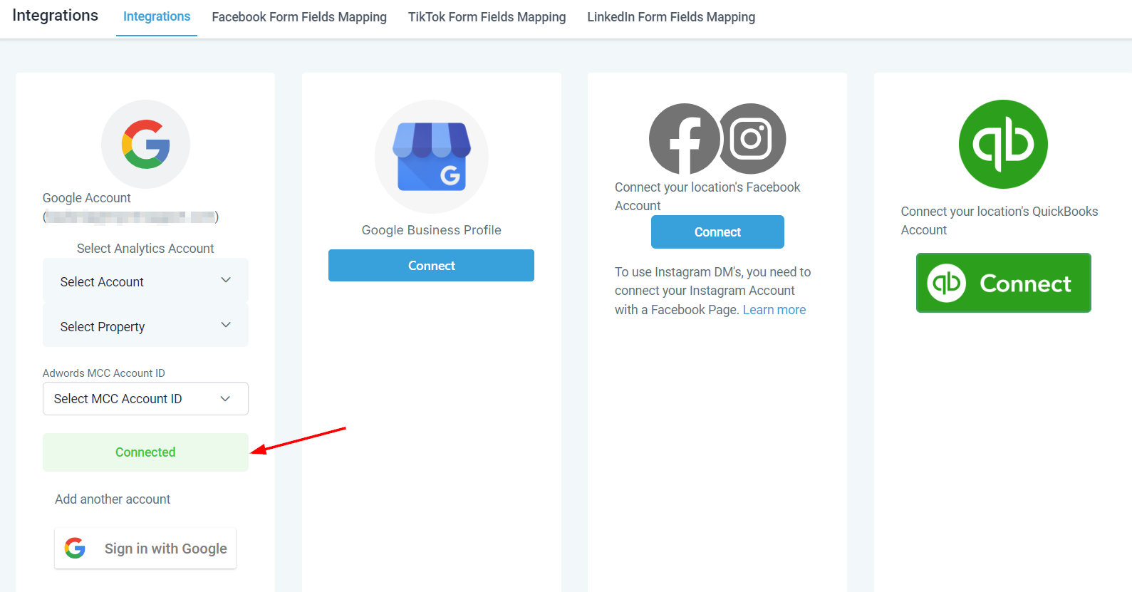After granting the required permissions, you will be redirected back to the Integrations settings. Here, you will see a confirmation that your Google account has been successfully integrated.