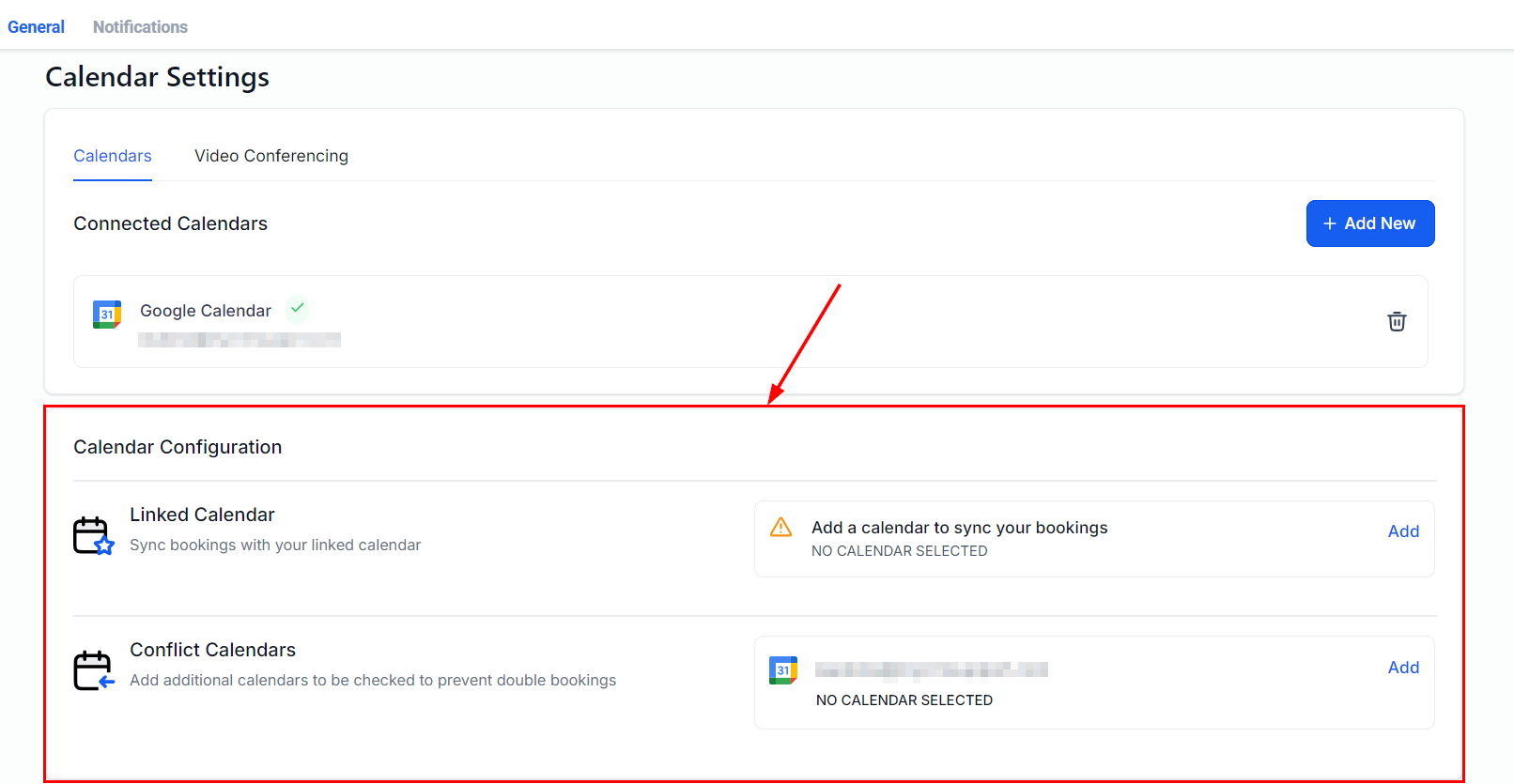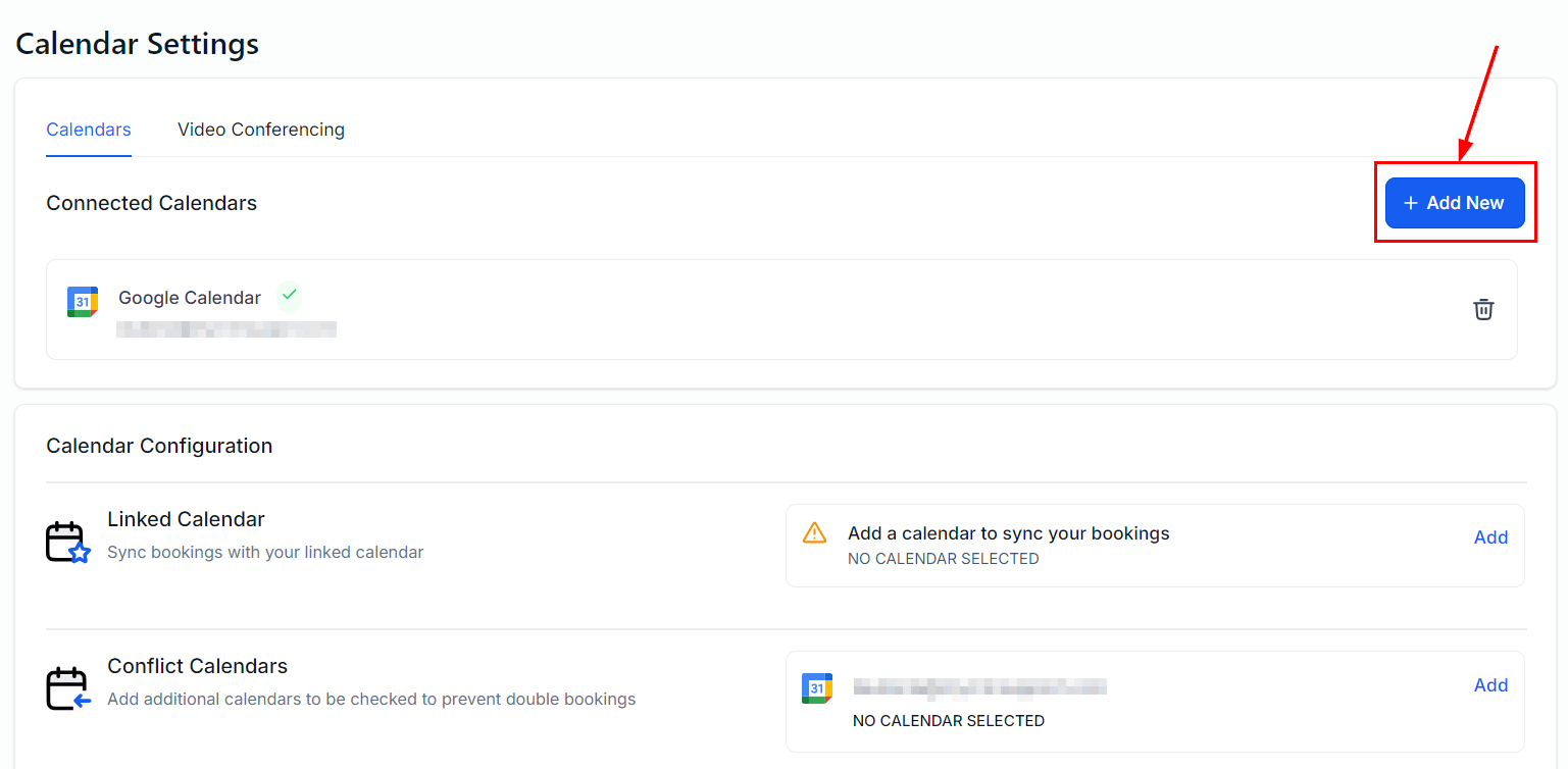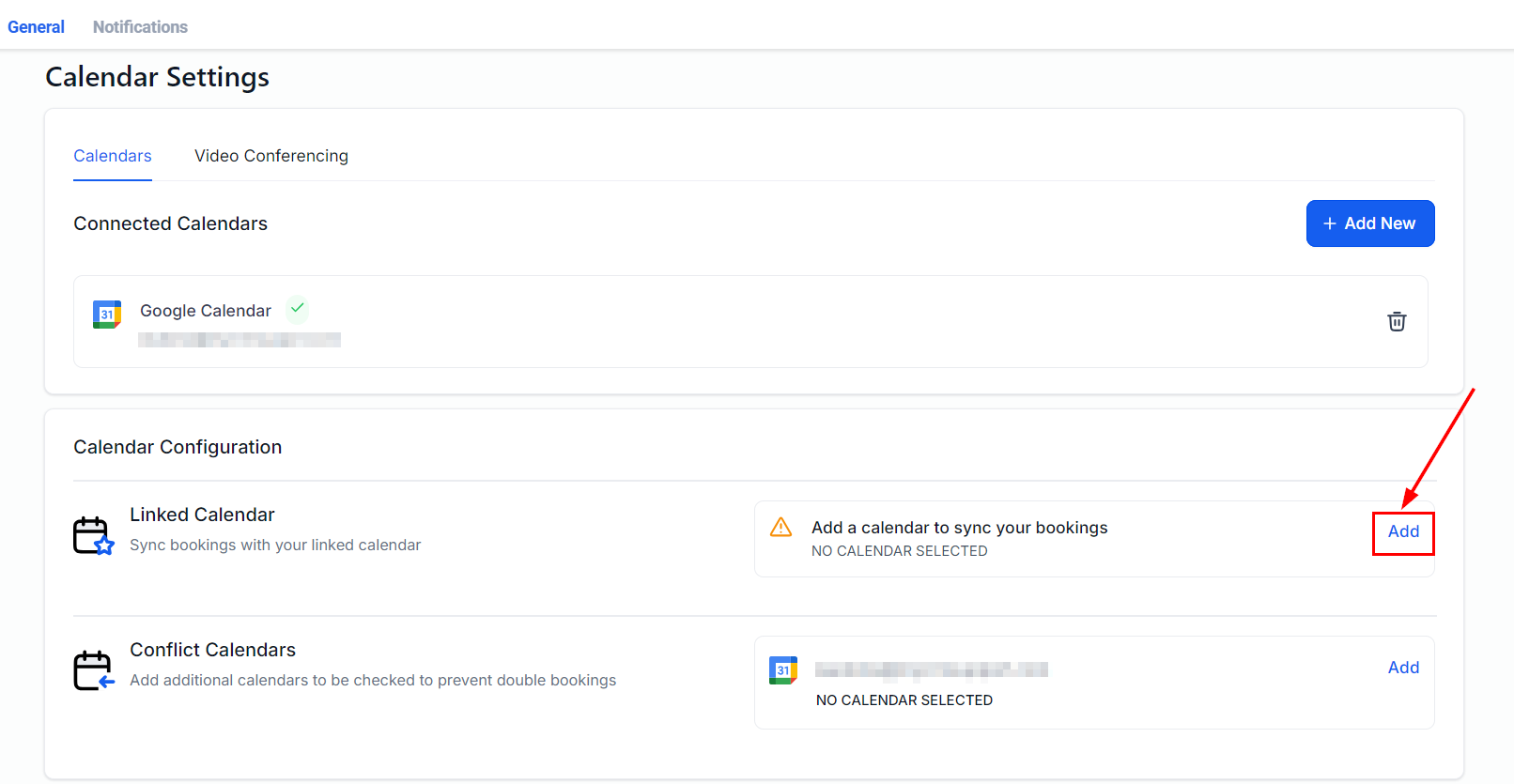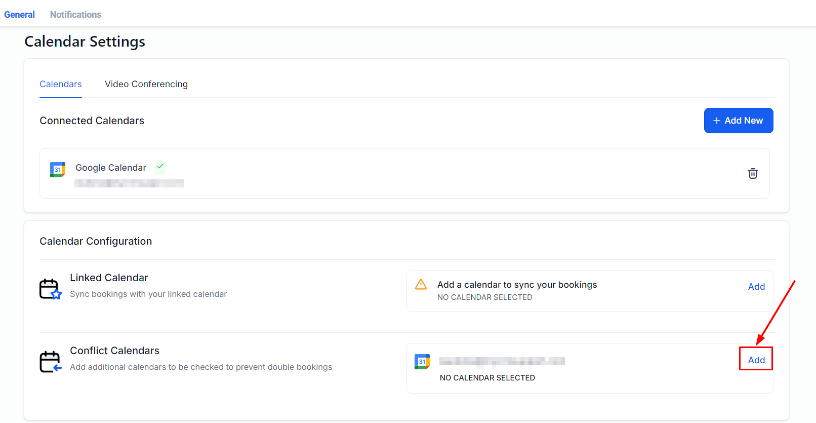 After integrating your calendar, you have the option to manage potential conflicts by editing your conflict calendars. To do this, click the Add button under the Conflict Calendars section.