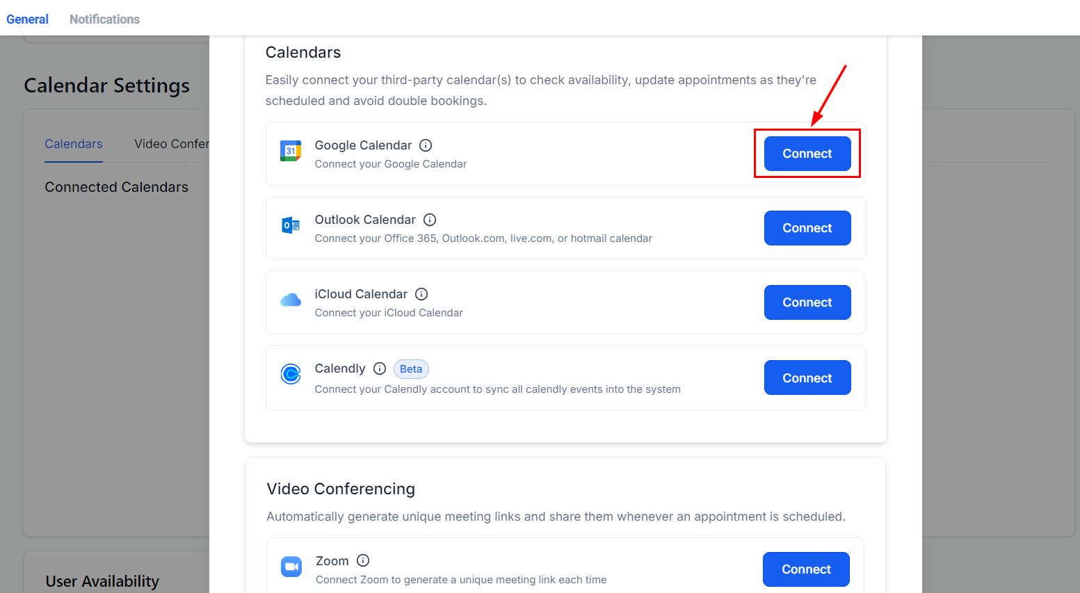 Next, click the Connect button corresponding to “Google Calendar” to initiate the integration.