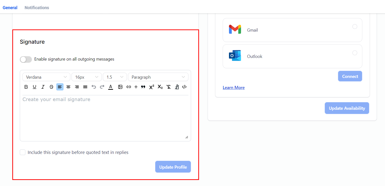 The My Profile section allows you to customize and manage your personal account settings efficiently. Here, you can update your profile information, create an email signature, change your password, manage email 2-way sync with Gmail or Outlook, designate your primary calendar for better organization and convenience, and set your availability status for proper scheduling.