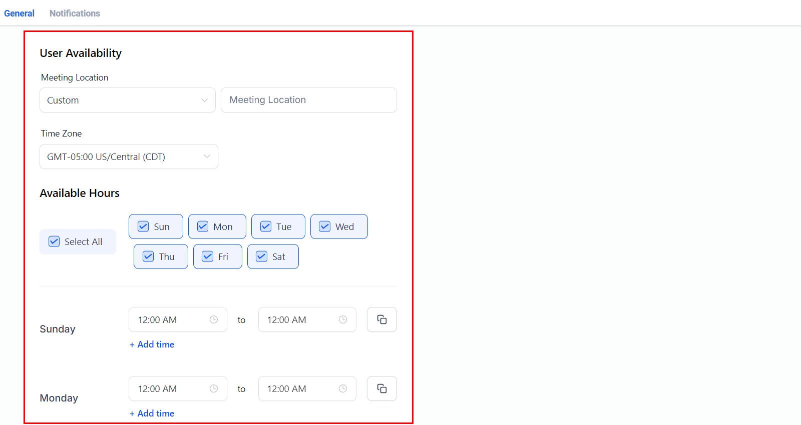 Meeting Location: Choose your default meeting location, whether a virtual Zoom meeting or a physical address.
