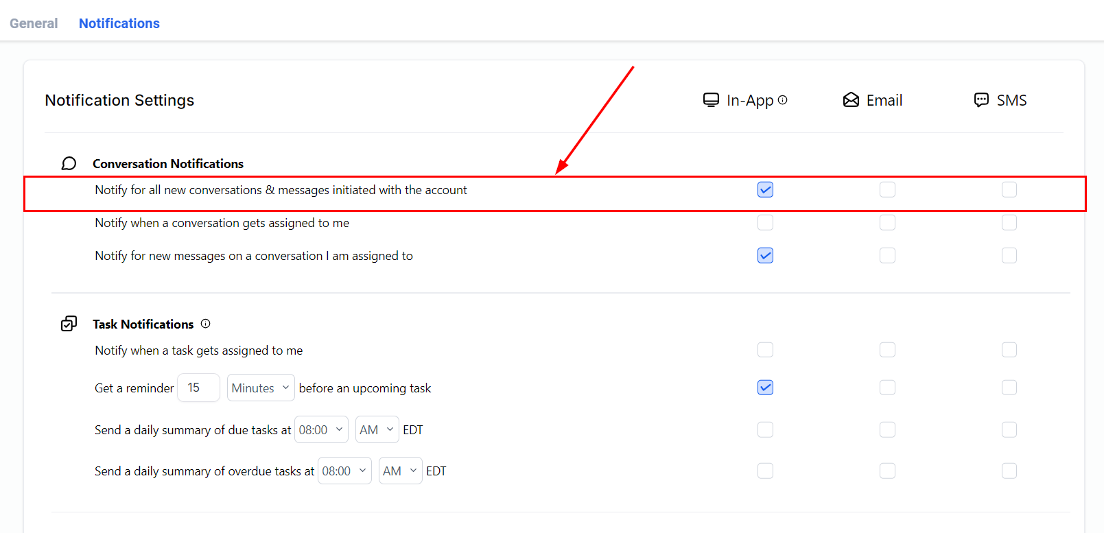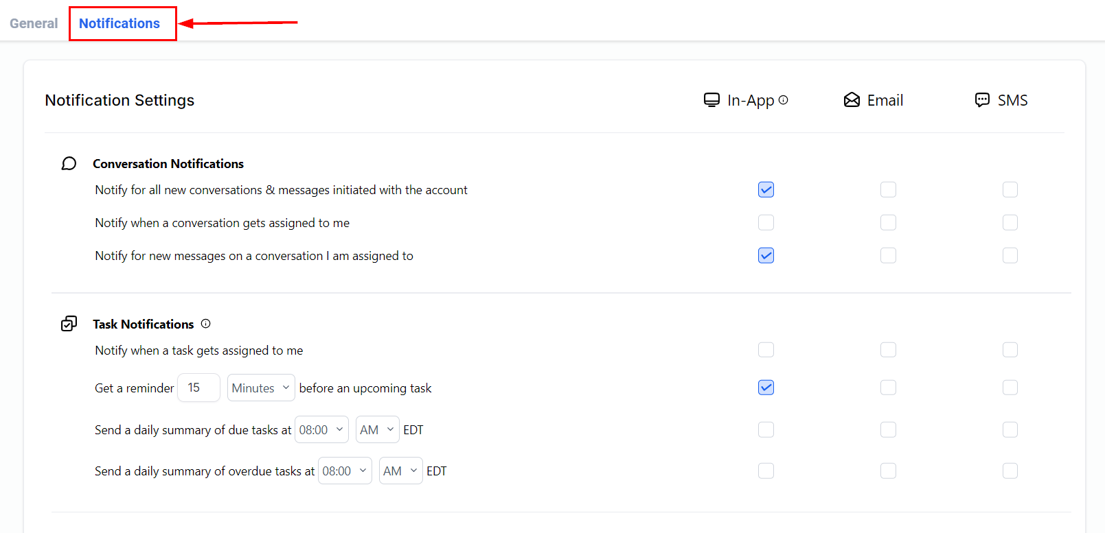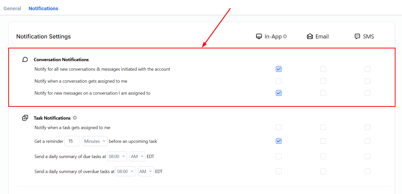 Here, you can adjust your notification settings to manage conversations, tasks, or social media updates.