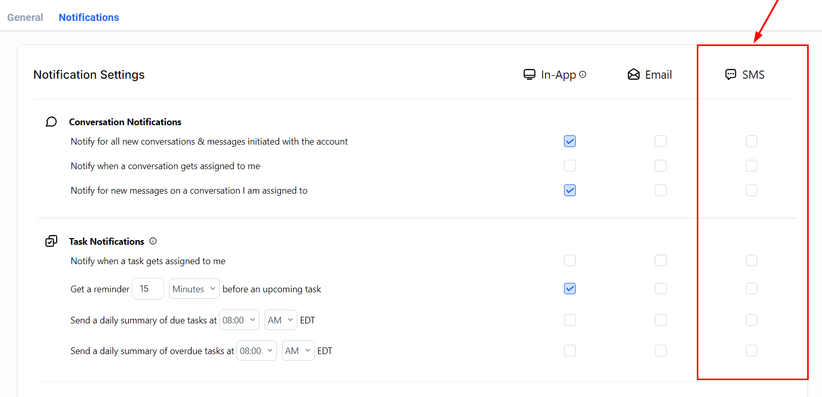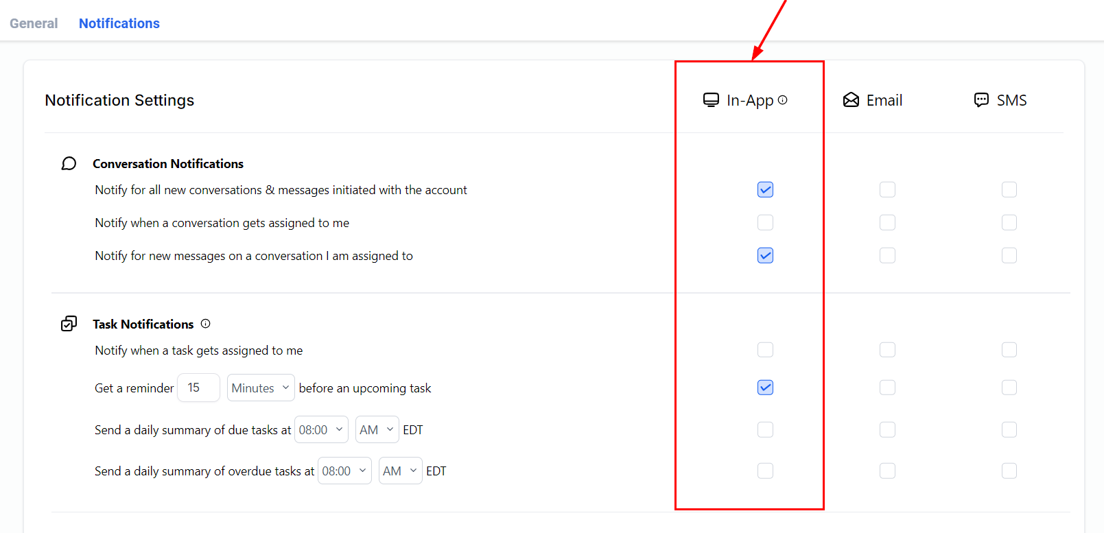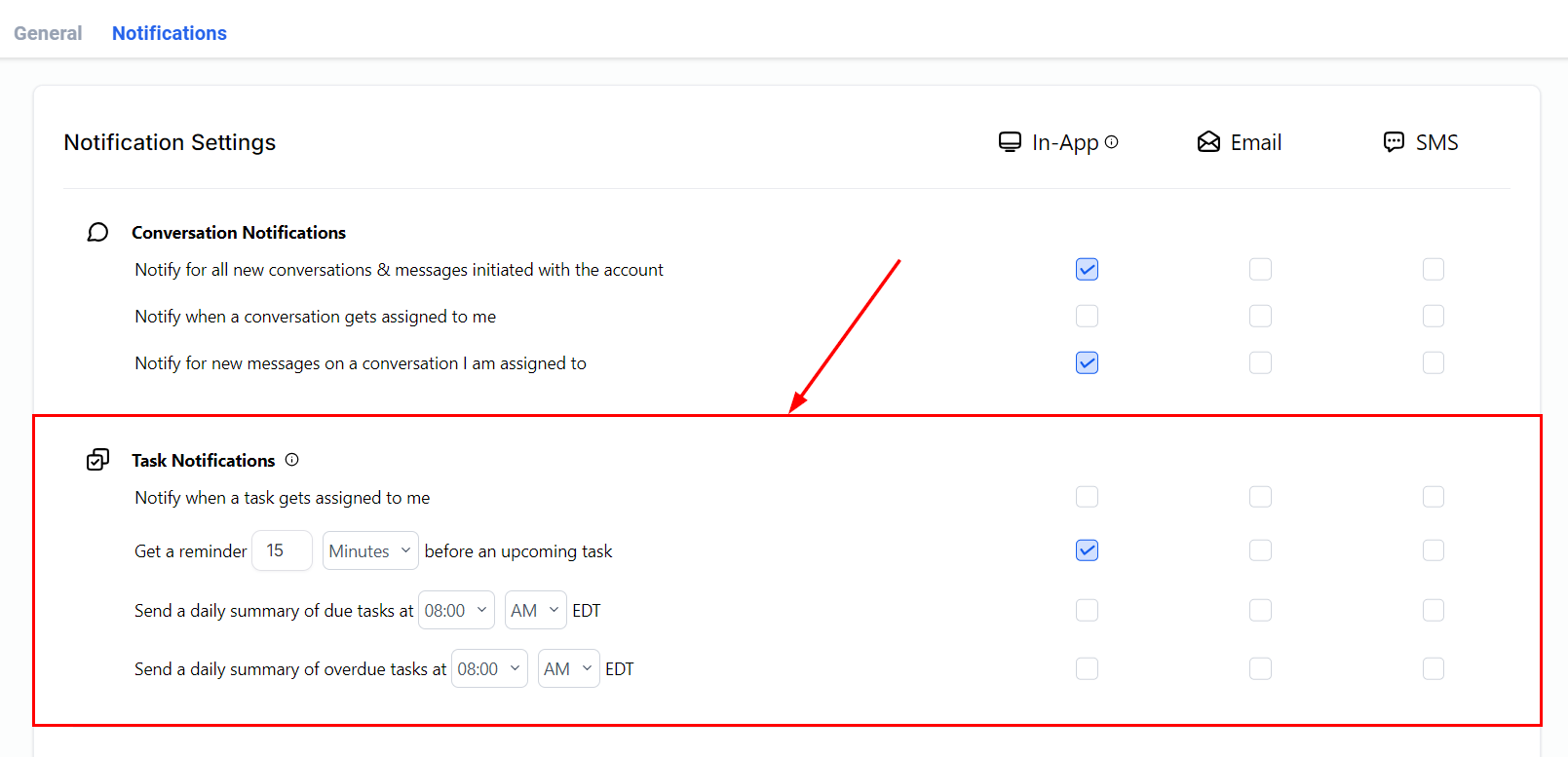 Here, you can adjust your notification settings to manage conversations, tasks, or social media updates.