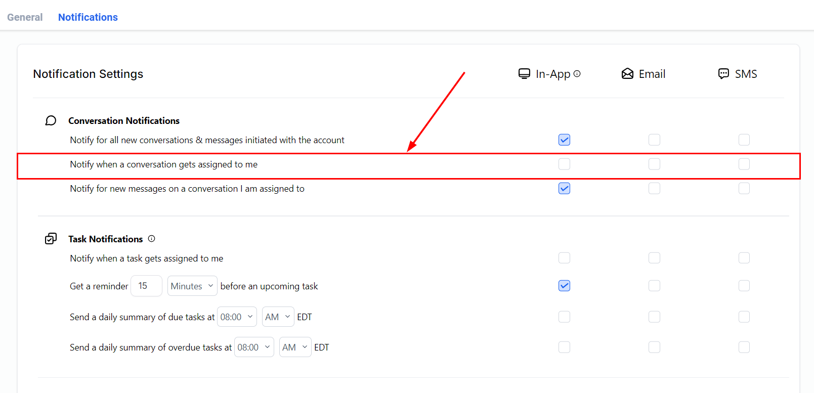 When enabled, the option to notify when conversations are assigned to you can keep you up to date with your tasks. With this feature, you can get an alert promptly delivered right to your preferred channel.
