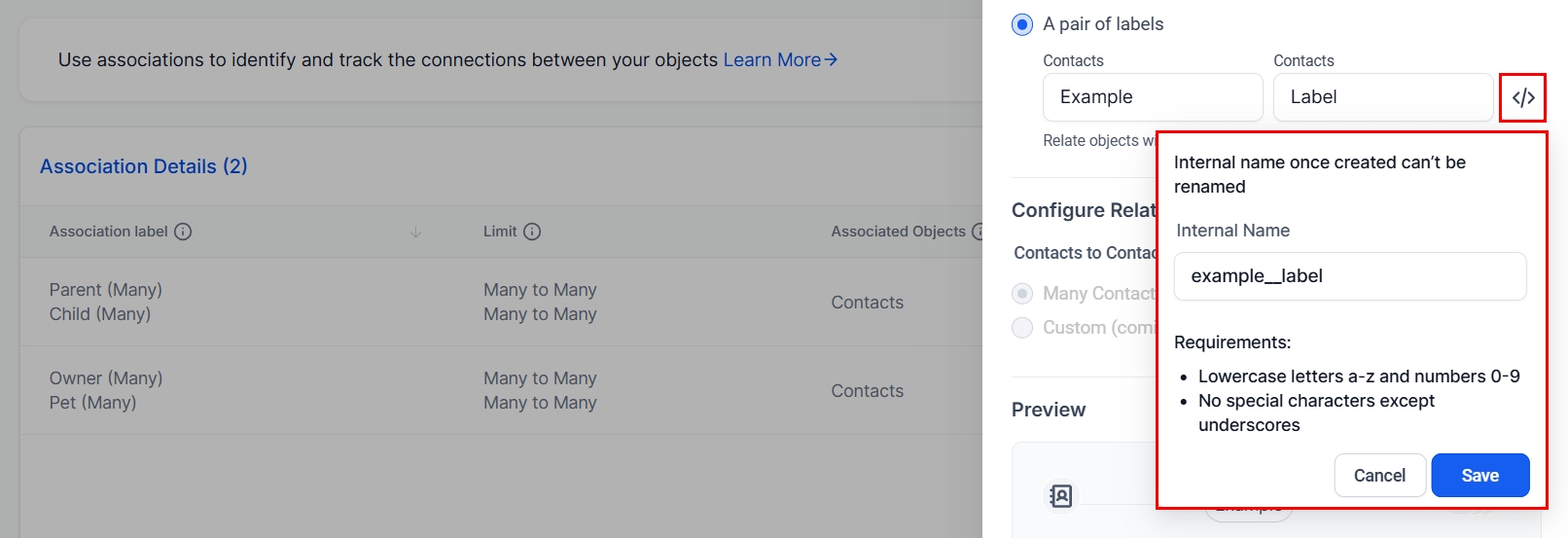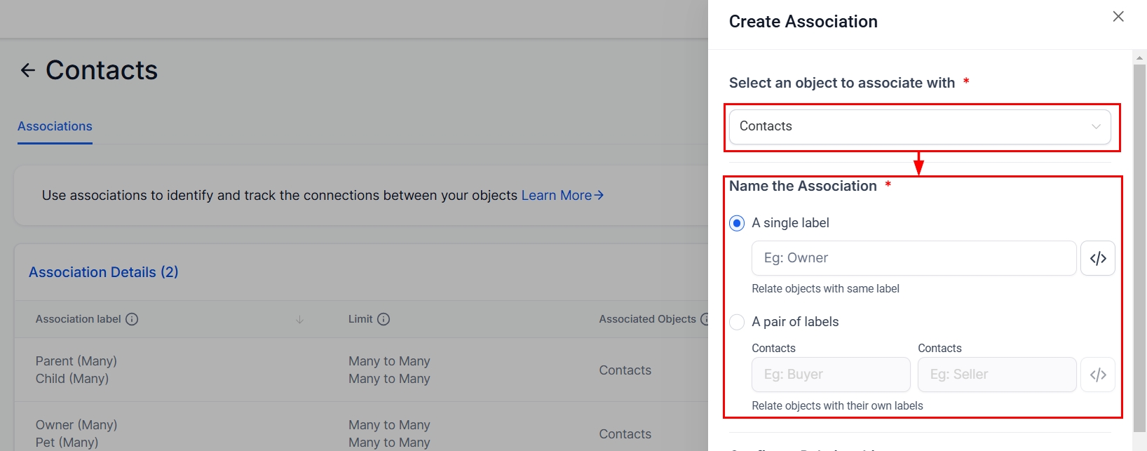 Select the contact object to associate, then choose either a single label or a pair of labels and give them a name.