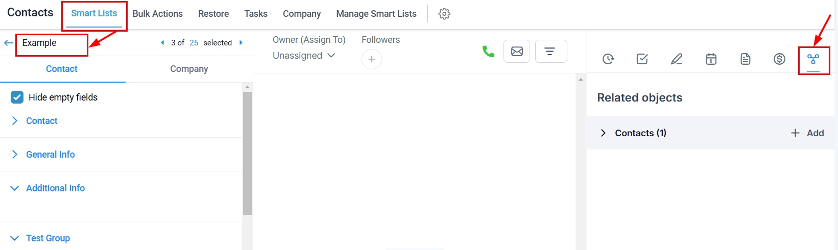 View Linked Contacts: A dedicated section within the contact details view displays all linked contacts, grouped by their association labels, providing a clear overview of related contacts.