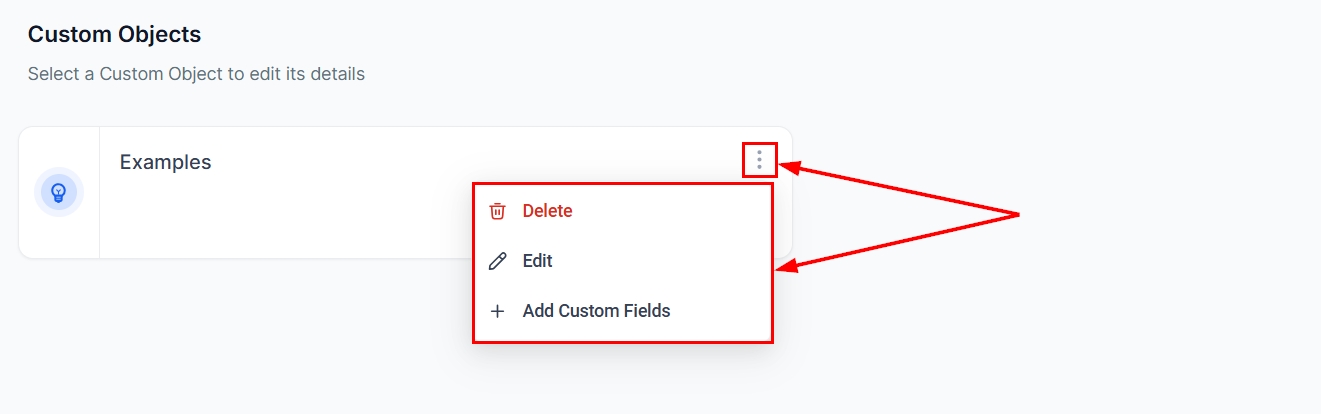 Edit, delete, or add custom fields to the custom object by choosing the relevant option from the actions menu.