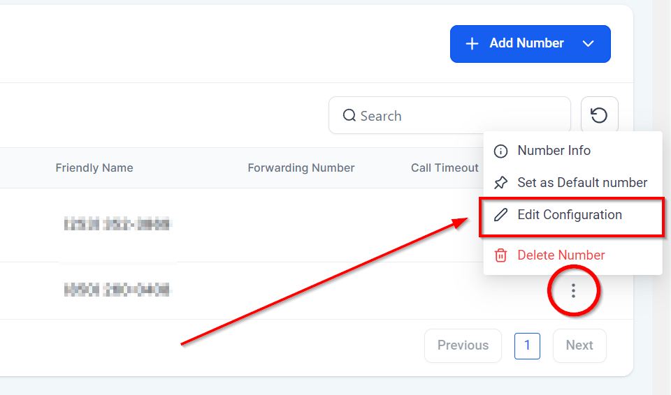 Click the three-dot menu next to the phone number you wish to enable the call recording for, then click the “Edit Configuration” option.