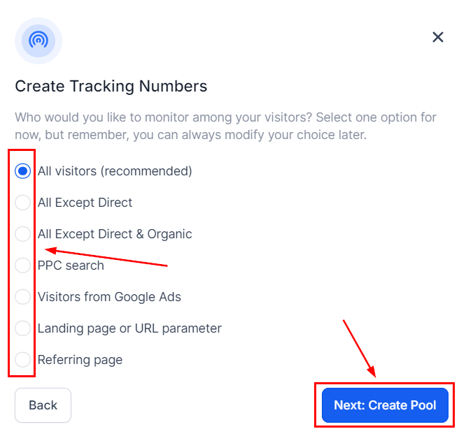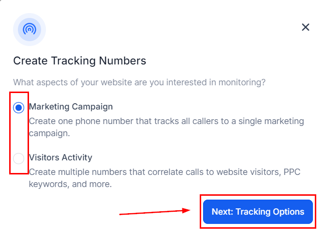 Select Marketing Campaign to monitor calls related to a specific campaign or Visitors' Activity to track the caller's original interaction with your content, then click Tracking Options.