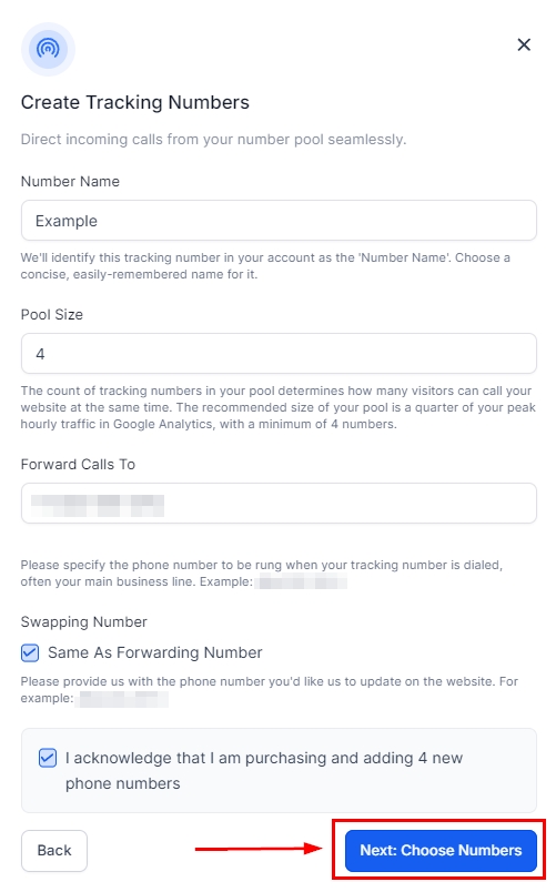Set up a number pool to track call metrics such as duration, caller ID, and call source. To do so click on + Add Number then select Add Number Pool.