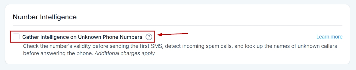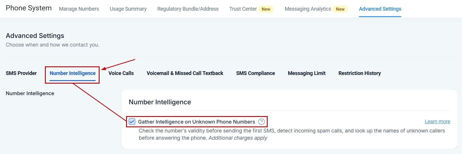 Select the Number Intelligence tab and check the box next to Gather Intelligence on Unknown Phone Numbers.