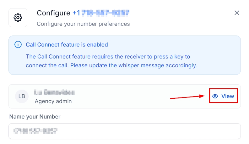 When a user is assigned a phone number you can see it reflected at the top of the Phone Number settings. Clicking on View will redirect you to the section My Staff to handle the user phone settings.