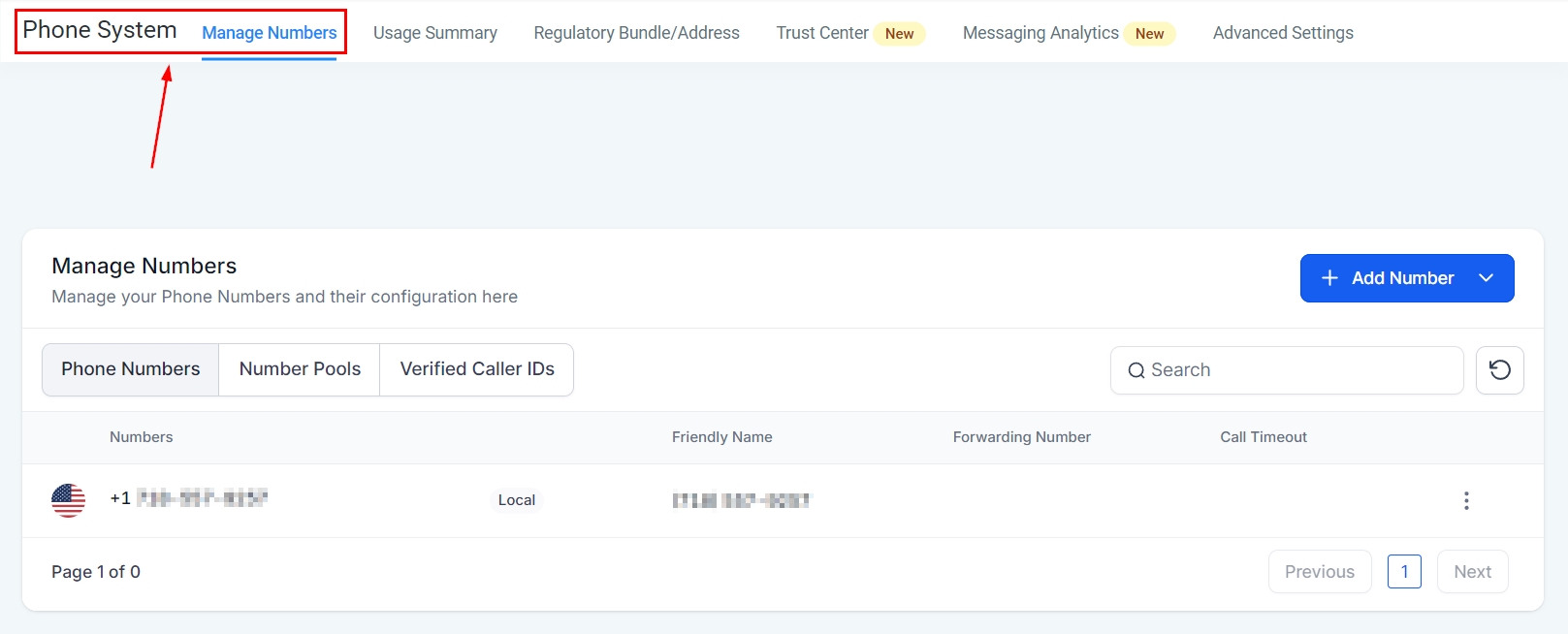 To start head over to your Settings and open the Phone Numbers section, this should open the Manage Phone Numbers tab by default.