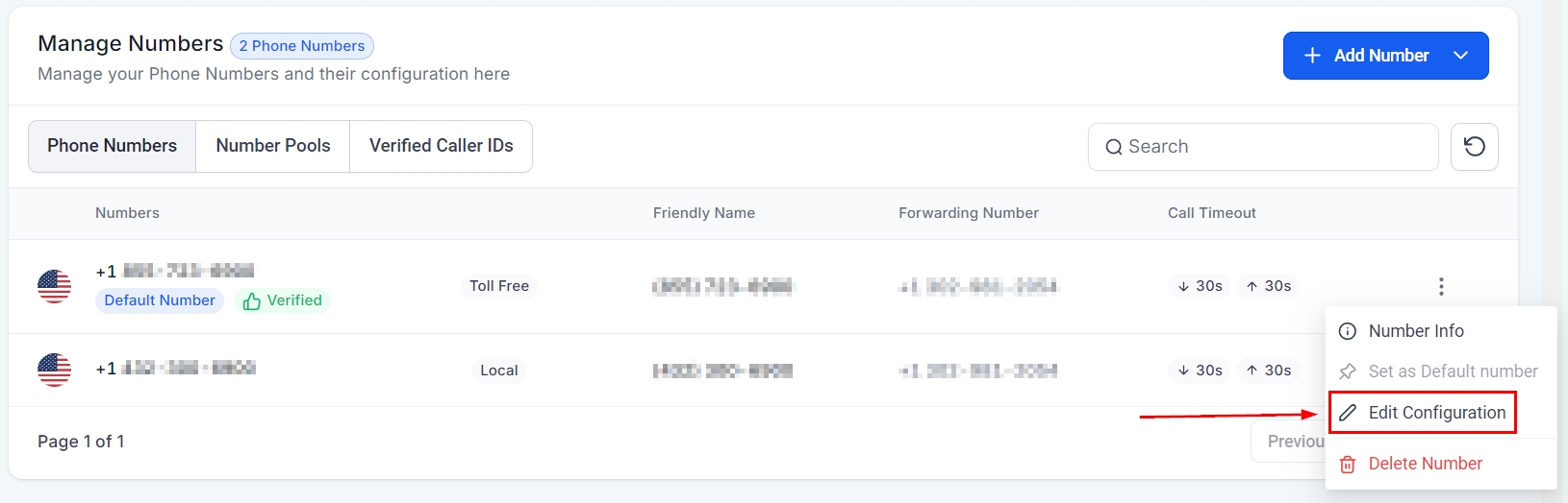 Of your desired phone number click on the Three dots icon to open the options and select Edit Configuration.