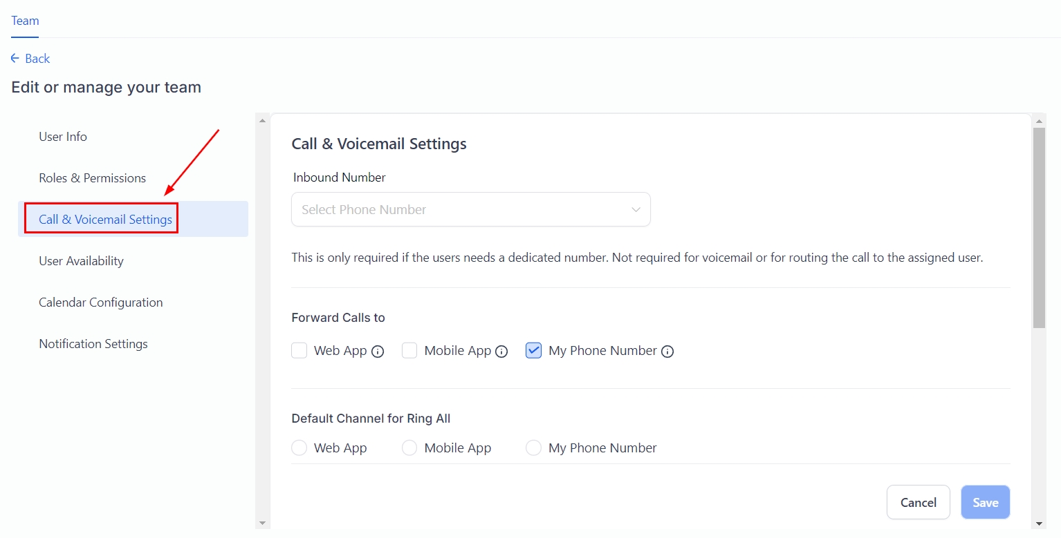 Under Inbound Number select the CRM phone number you want to assign to the user.