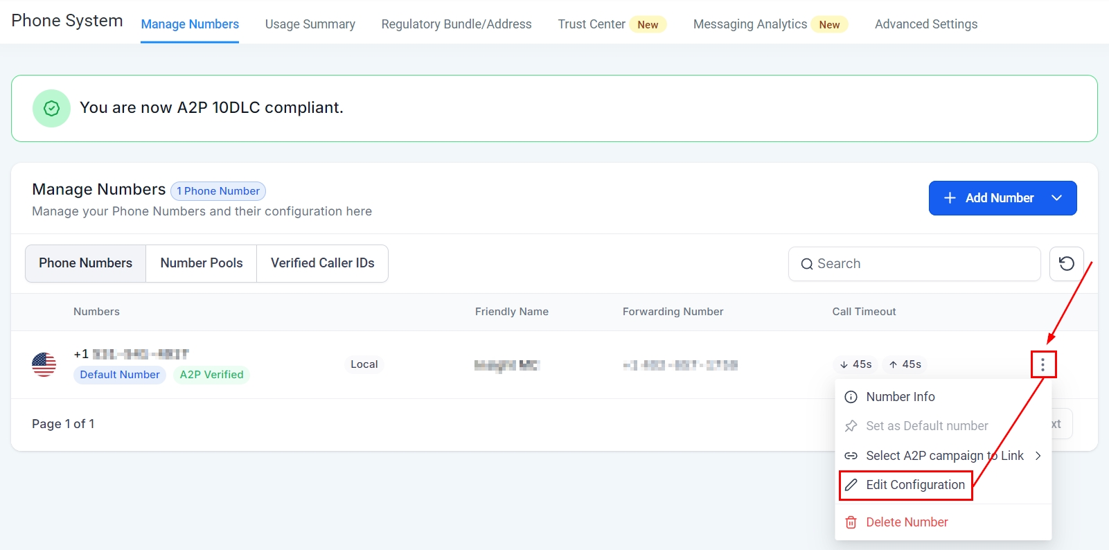 To turn on call recording go to Settings in the bottom left-hand corner & then find Phone Numbers. Click the 3-dot icon, then select Edit Configuration to enable the call recording option.