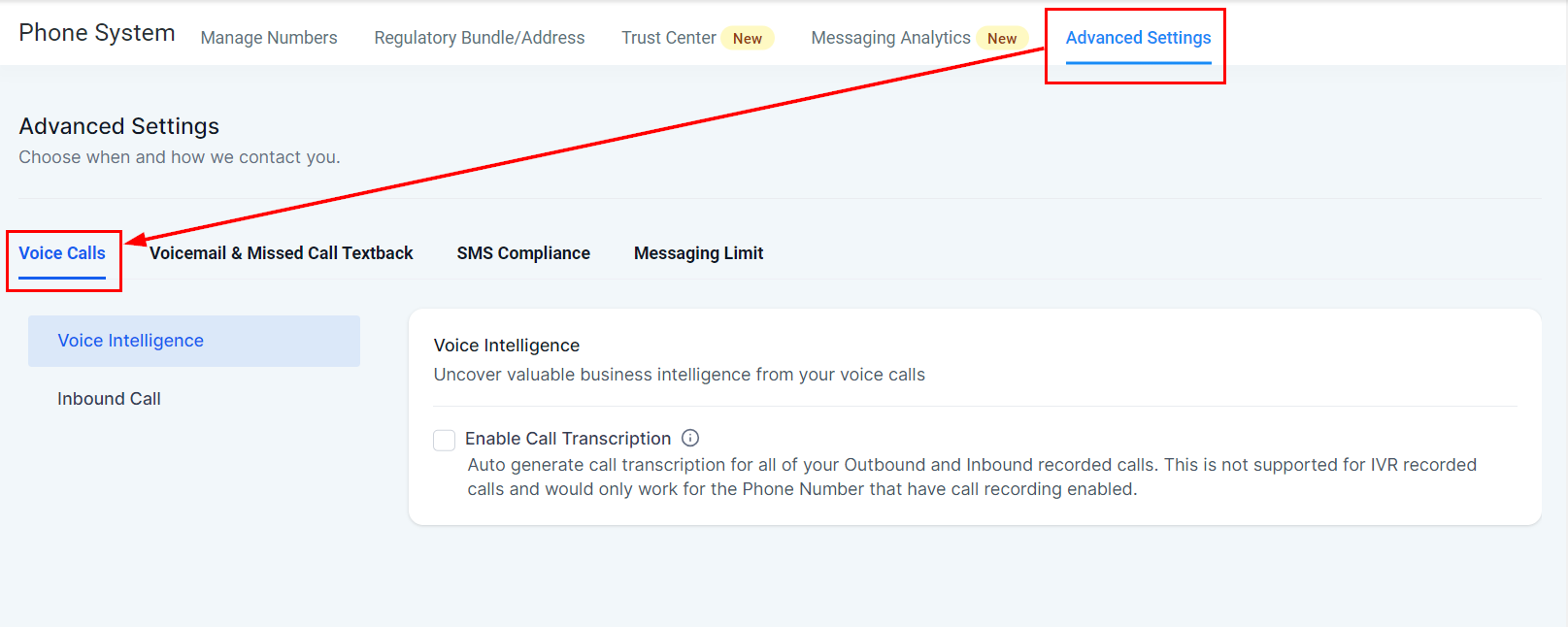Solution: Ensure that call transcription is enabled in the advanced settings under the voice calls tab.