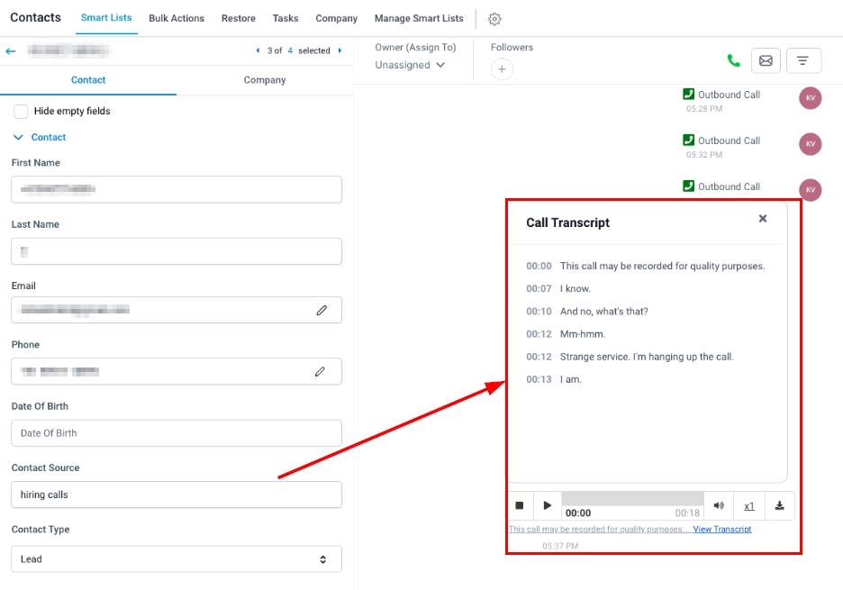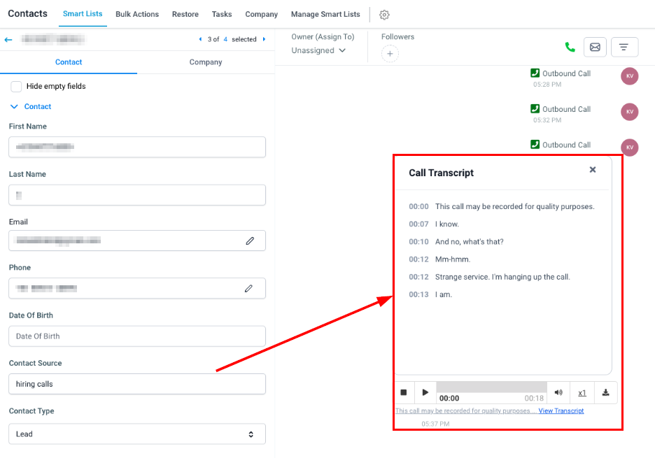 Once call transcriptions are enabled, you can access the transcripts for recorded inbound and outbound calls by selecting the contact card within the Conversations or Contacts tab.