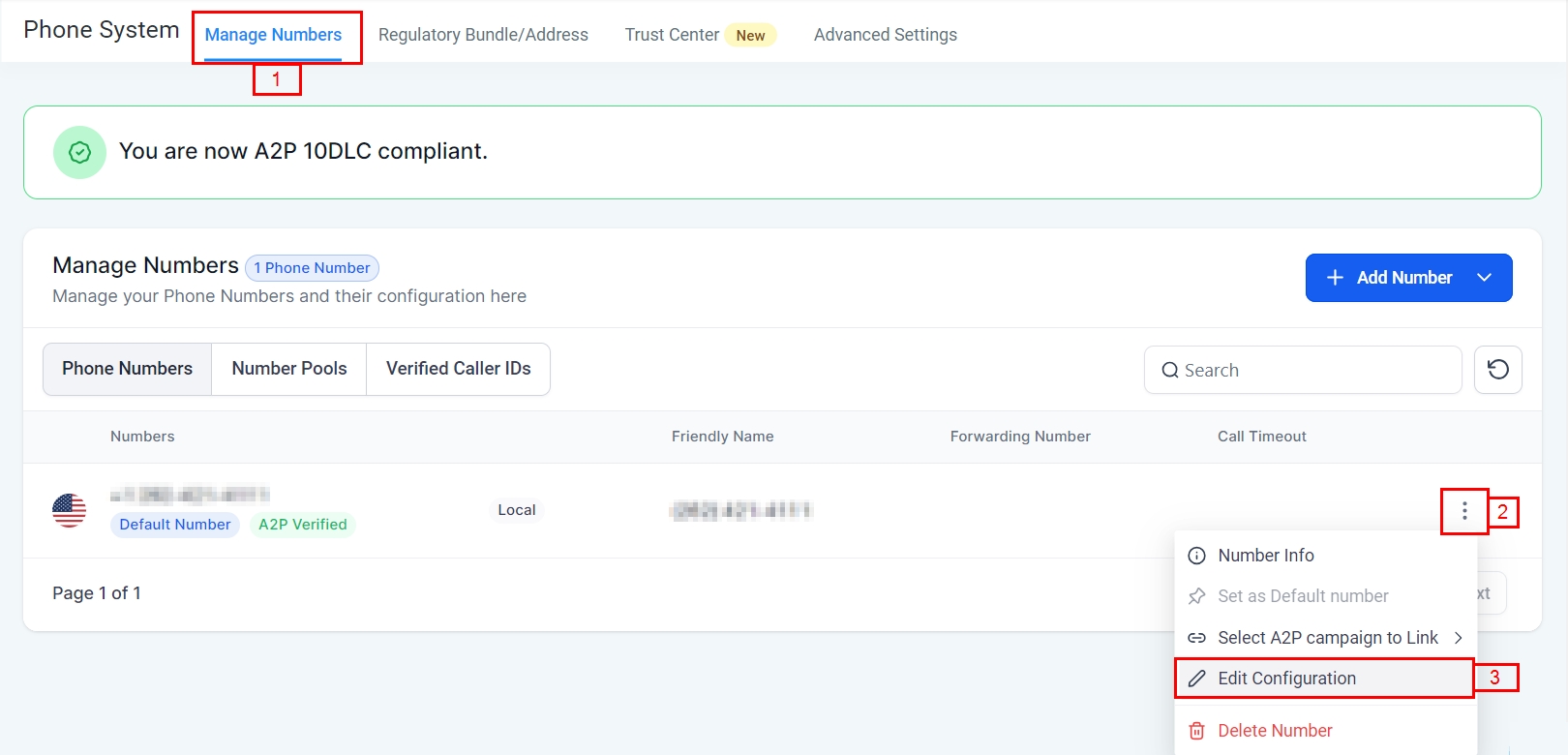 Edit Phone Number Configuration: In the 'Phone Numbers' tab, select the three dots beside the number you wish to configure and select 'Edit Configuration'.