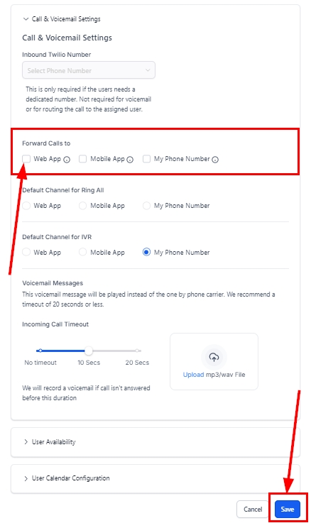3- Check the boxes for the incoming call to go to the contact's assigned agent, if unchecked the call will go to the agent linked to the called number instead.