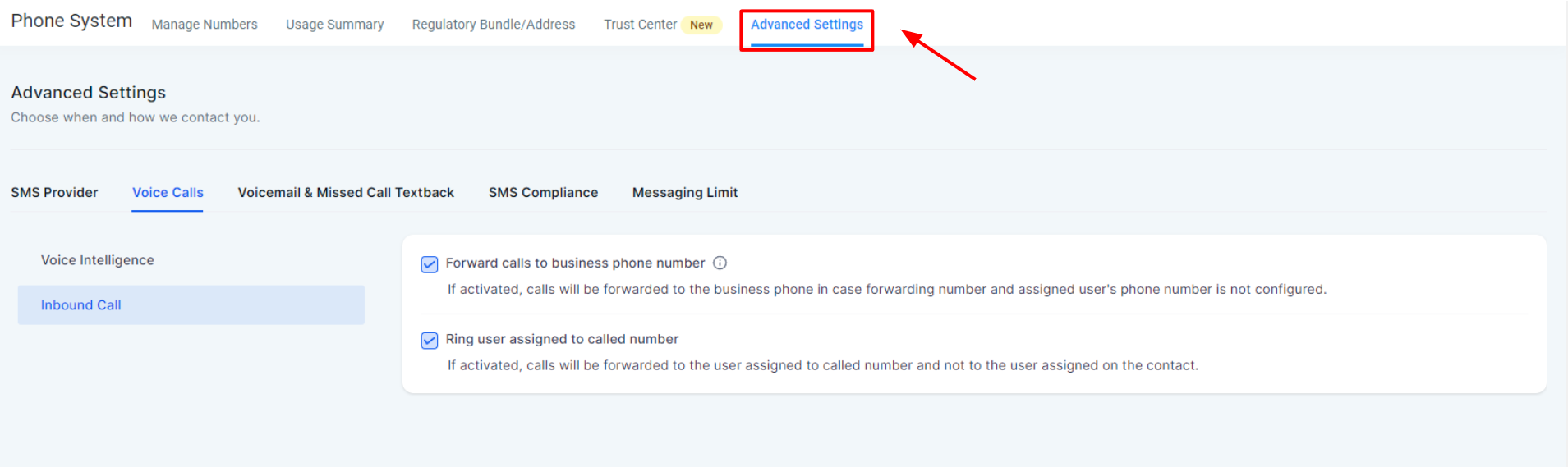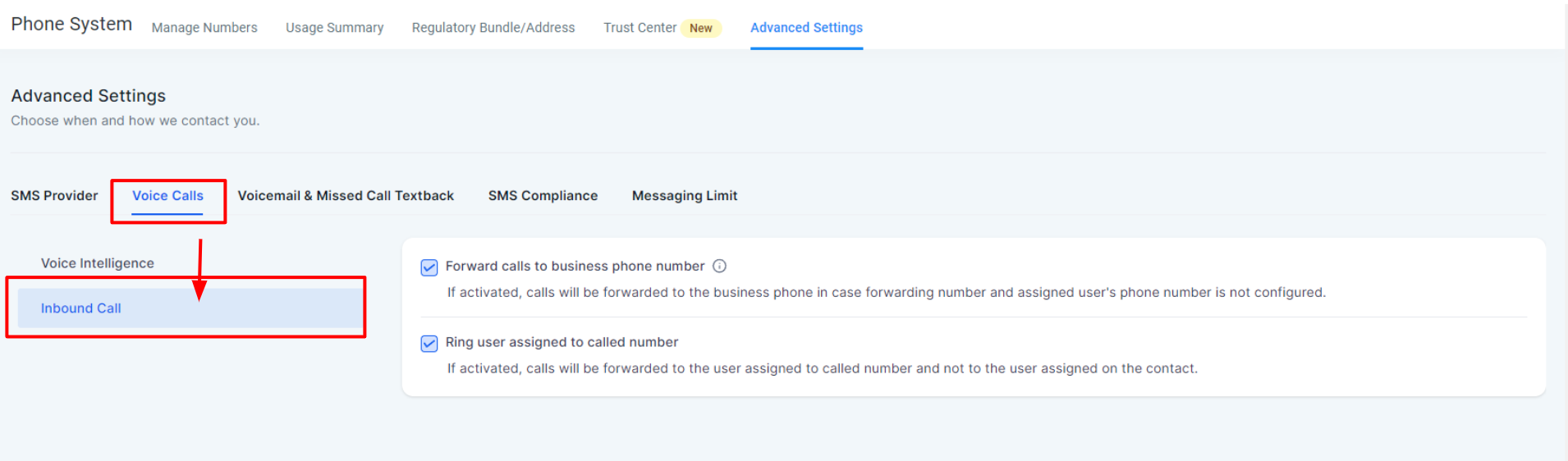 2- Open the Voice Calls tab and select the Inbound Call section