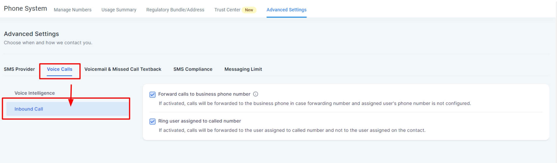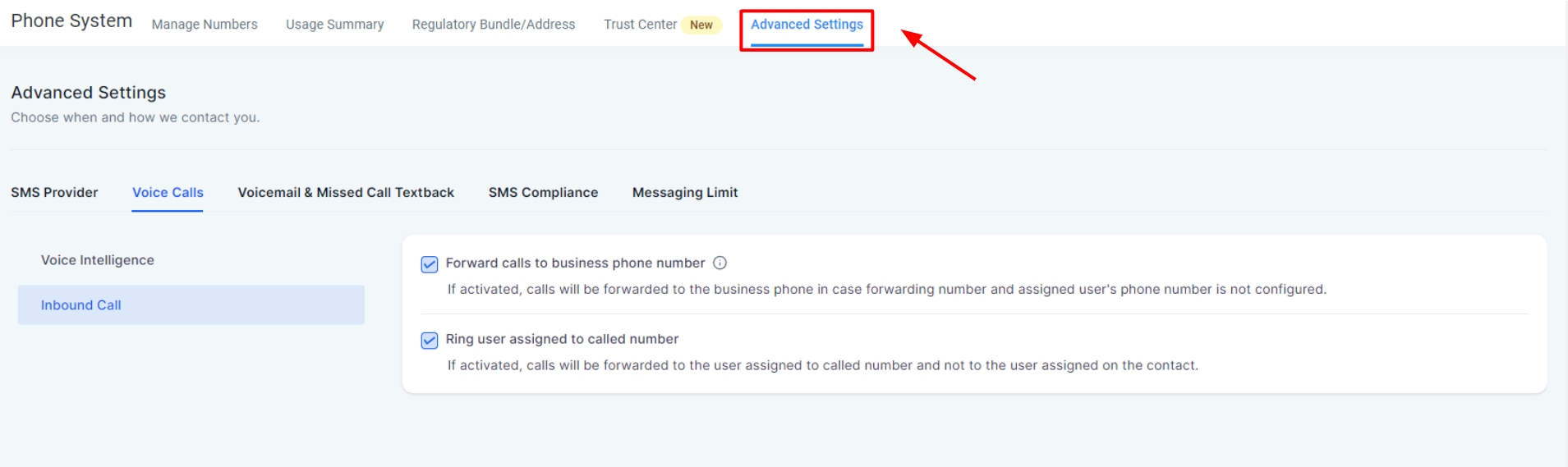 Once your team has interacted with a contact, you may redirect their incoming call to a specific agent. Here's how: 1- Go to Phone System in your settings and click on Advanced Settings